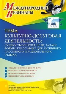 Международный вебинар Культурно-досуговая деятельность: сущность понятия, цели, задачи, формы, классификация активного, пассивного и рационального отдыха