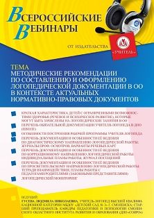 Вебинар Методические рекомендации по составлению и оформлению логопедической документации в ОО в контексте актуальных нормативно-правовых документов