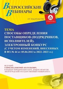 Вебинар Способы определения поставщиков (подрядчиков, исполнителей). Электронный конкурс (с учетом изменений, внесенных в ФЗ № 44 от 05.04.2013 в 2022 - 2023 г. г.)